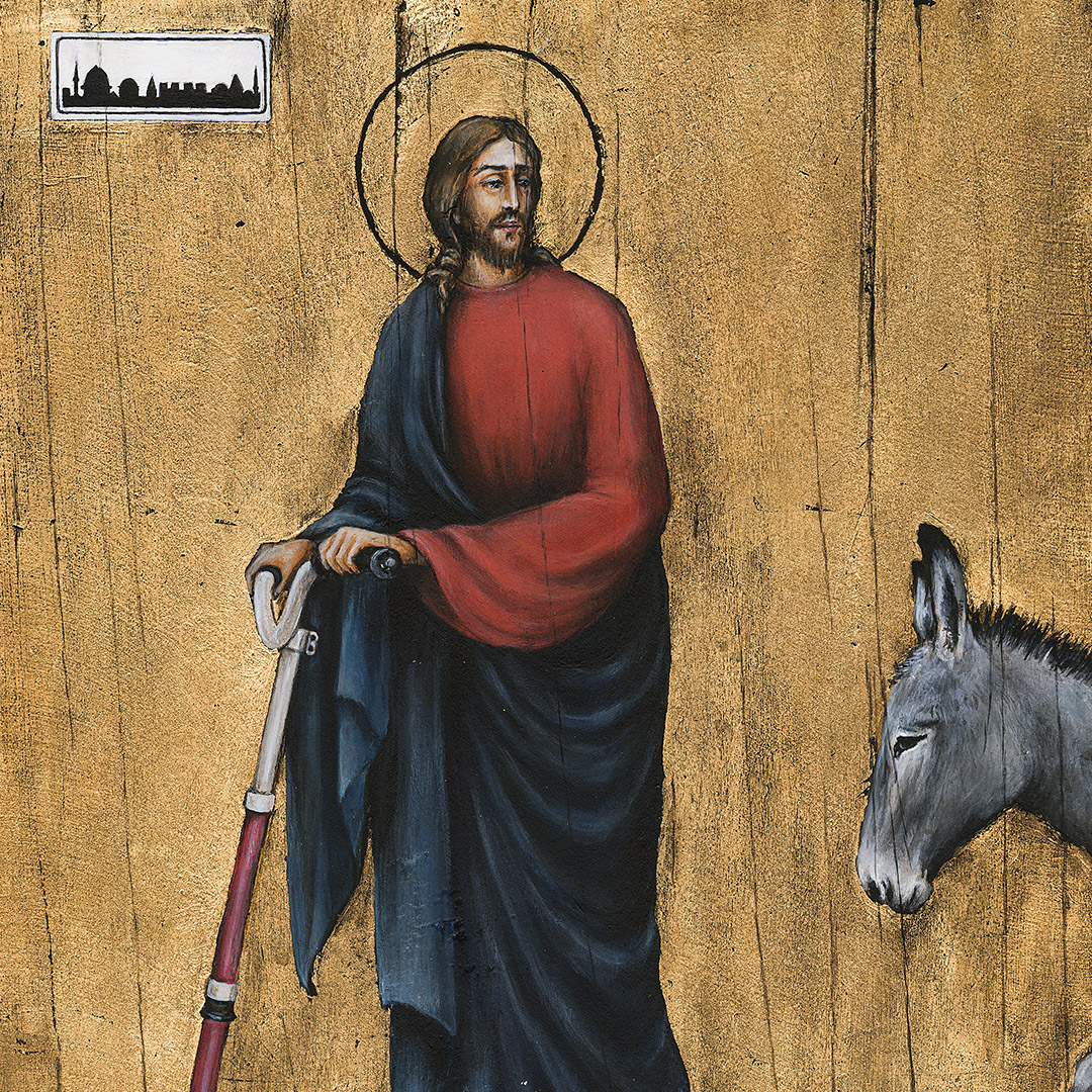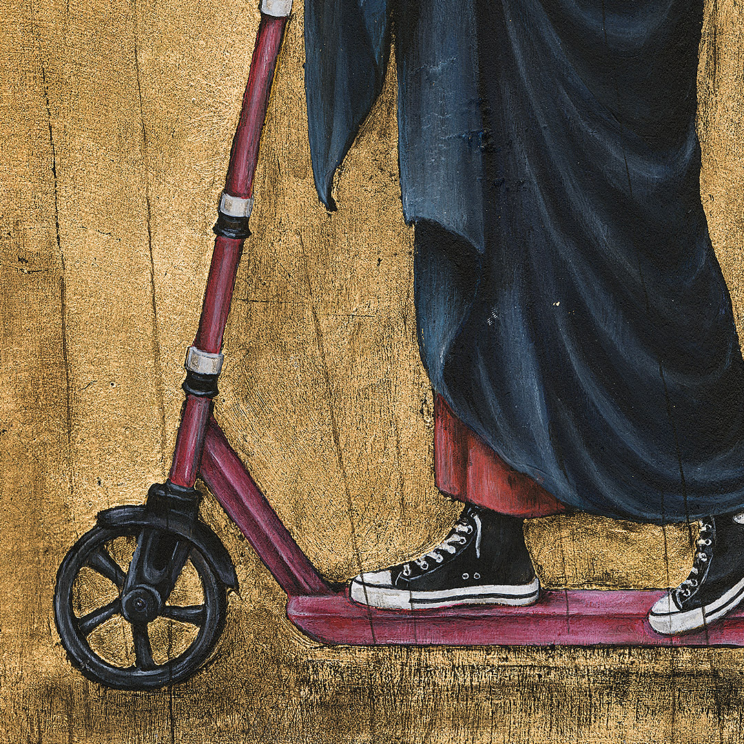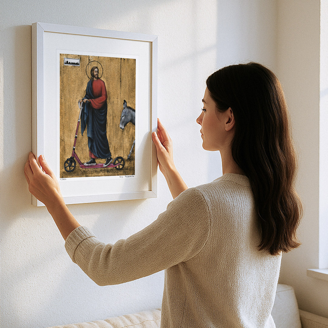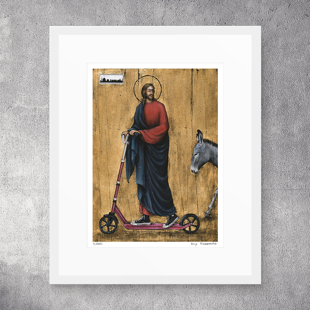 “Entrance. Episode Two” is a painting by Borys Fiodorowicz. ,in which the artist juxtaposes tradition with modernity, creating a narrative full of irony and symbolism. At the center of the painting we see the figure of Jesus presented in a surprising context – instead of riding a donkey, he enters on a modern scooter, wearing sports shoes.