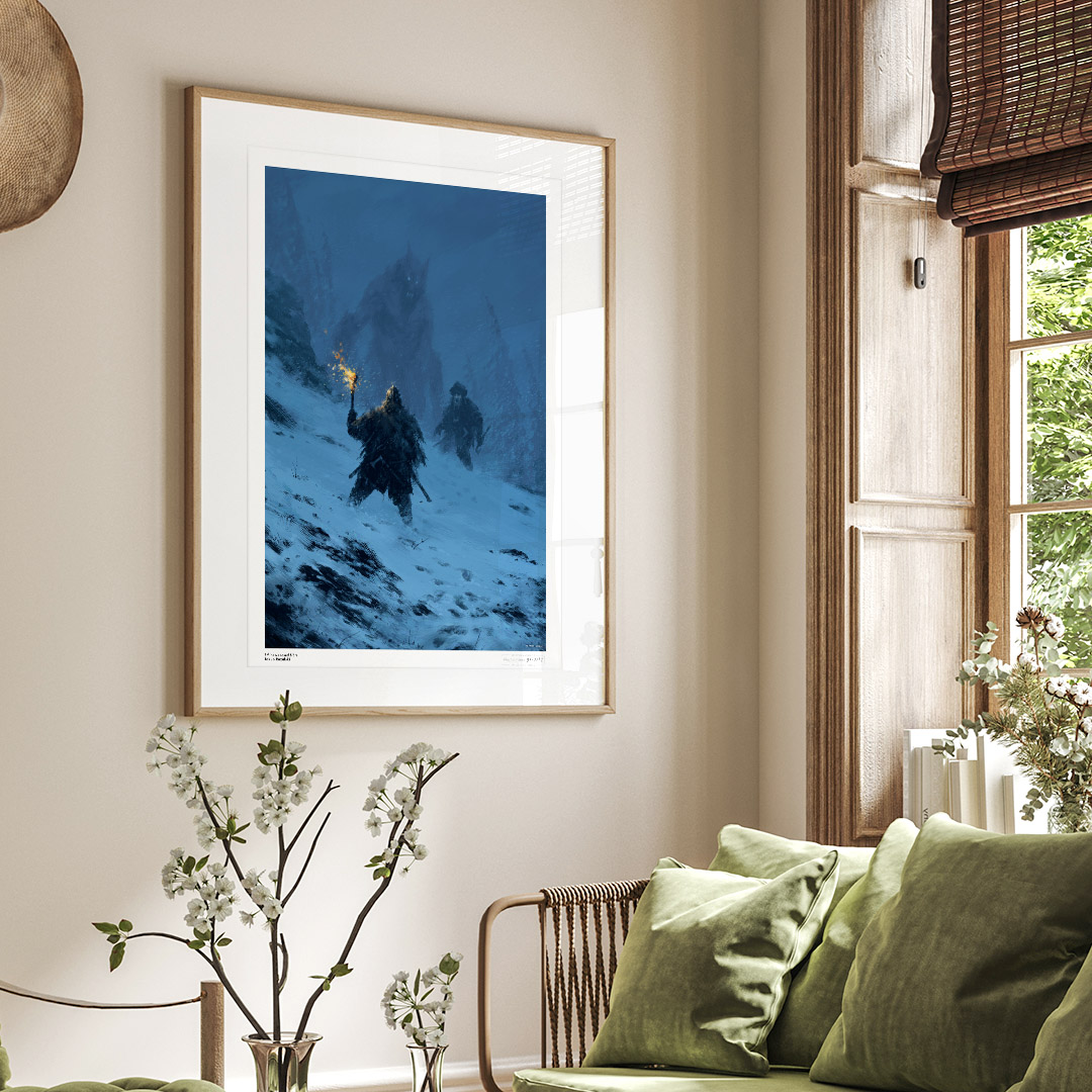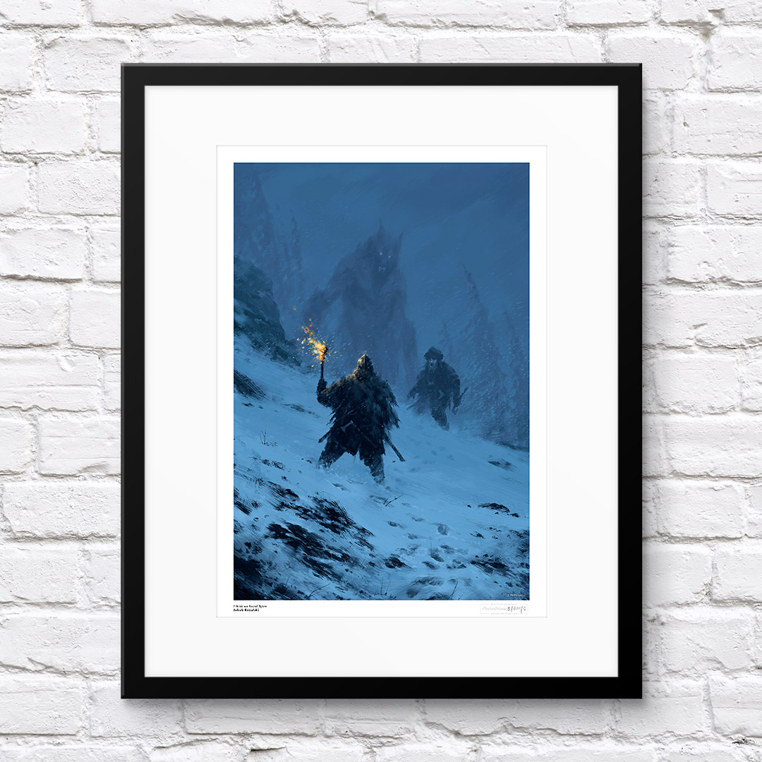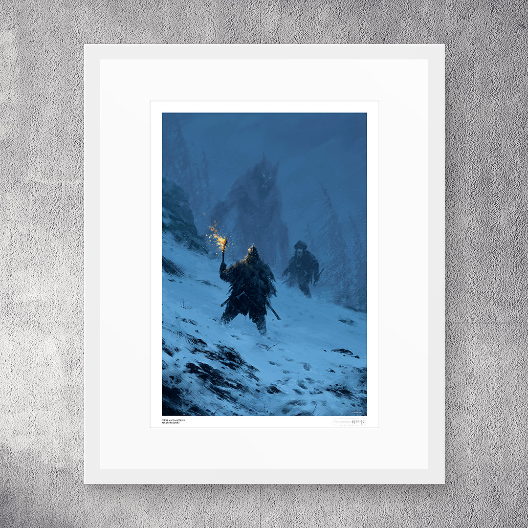 Deep in the frozen mountains, amidst a snowy blizzard, the heroes encounter a mysterious figure. Could it be Björn, the one they were searching for? In this dynamic scene titled “I Think We Found Björn”, Jakub Różalski masterfully captures the raw power of nature and the mysterious creatures lurking in the shadows. The intense atmosphere of fear and uncertainty is highlighted by the contrast between the fiery torch and the icy blue of the winter landscape. Discover this and other works by Jakub Różalski on the artist’s page.