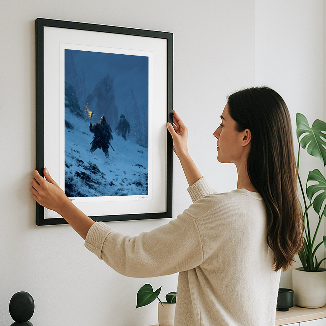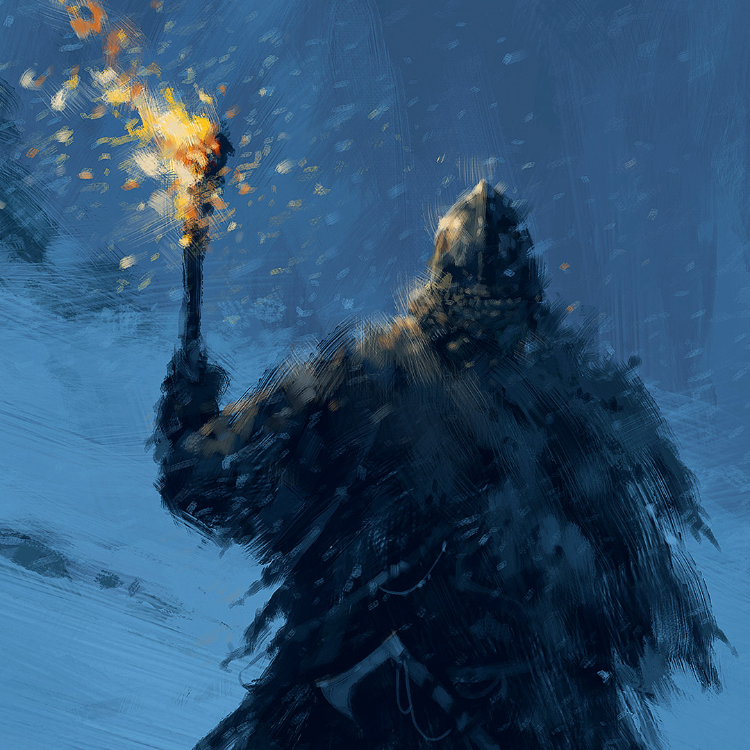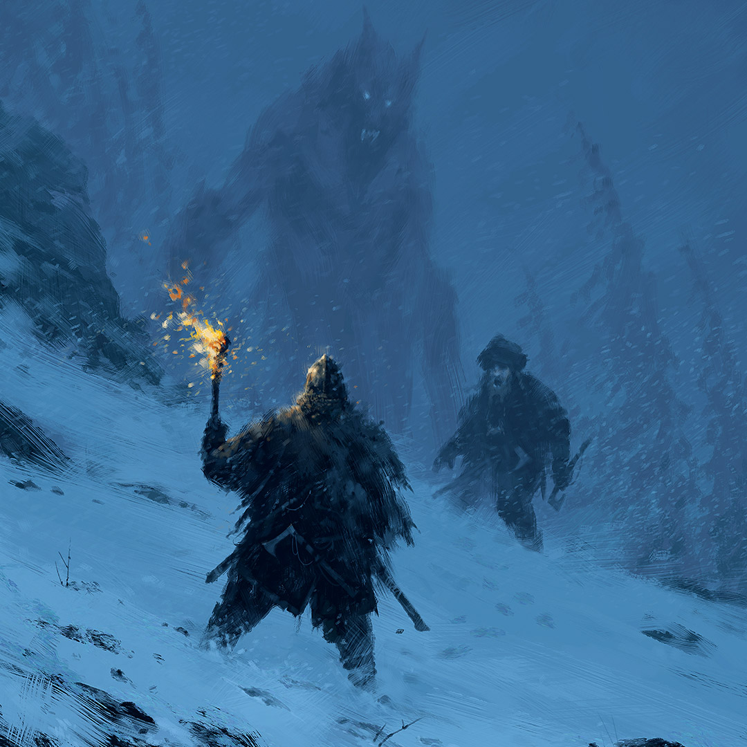 Deep in the frozen mountains, amidst a snowy blizzard, the heroes encounter a mysterious figure. Could it be Björn, the one they were searching for? In this dynamic scene titled “I Think We Found Björn”, Jakub Różalski masterfully captures the raw power of nature and the mysterious creatures lurking in the shadows. The intense atmosphere of fear and uncertainty is highlighted by the contrast between the fiery torch and the icy blue of the winter landscape. Discover this and other works by Jakub Różalski on the artist’s page.