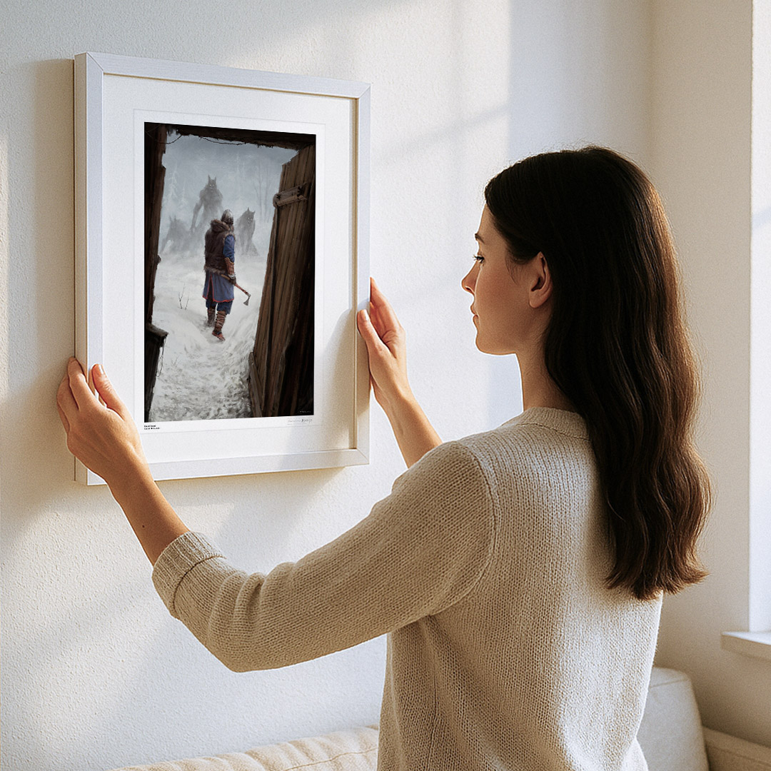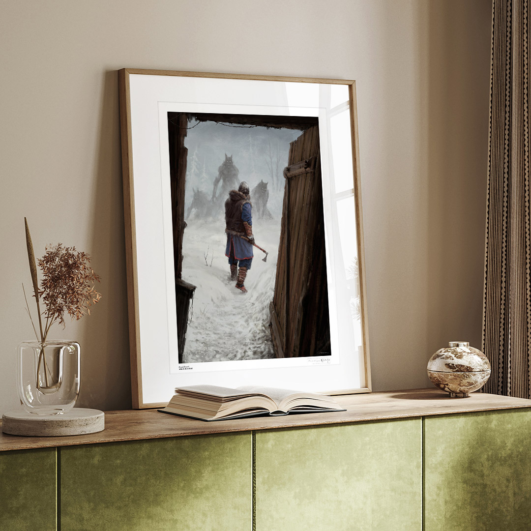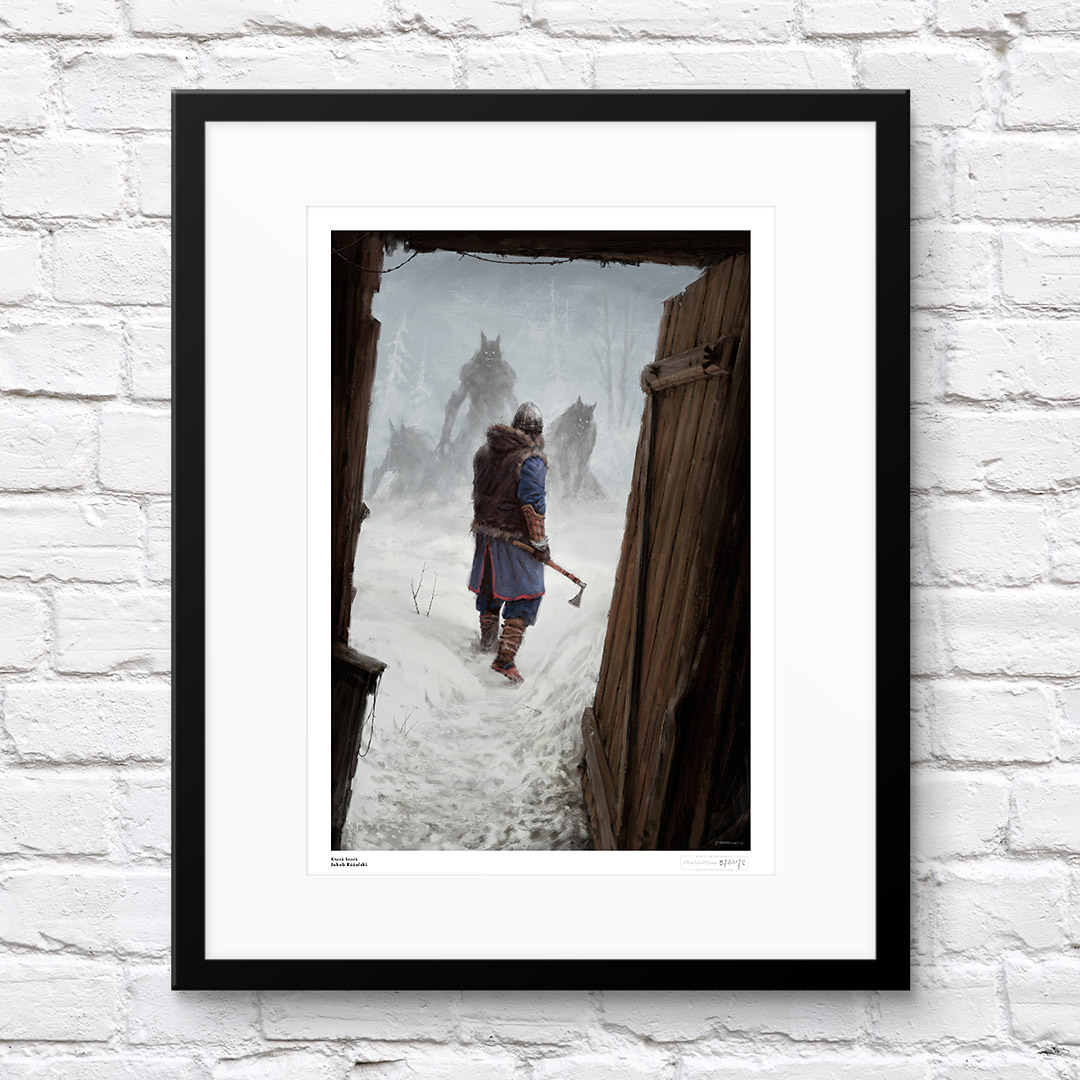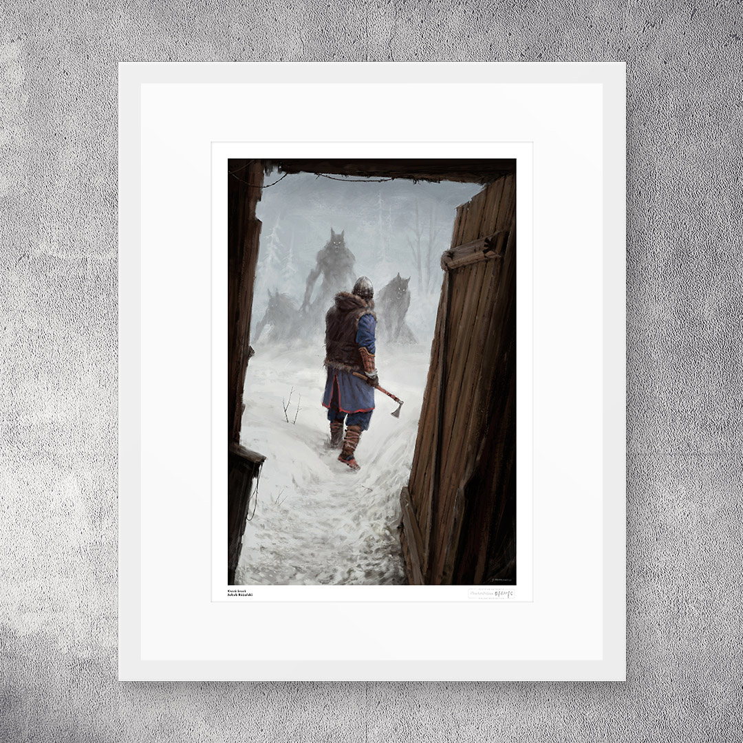 The painting “Knock Knock” by Jakub Różalski comes from the dark universe of “Wolfpack.” The work depicts a hero bracing for a confrontation with approaching werewolves, in a scene filled with tension and dread. The winter landscape and realistic details enhance the atmosphere of the impending clash. Add a unique mood to your space with the collector’s print “Knock Knock.”