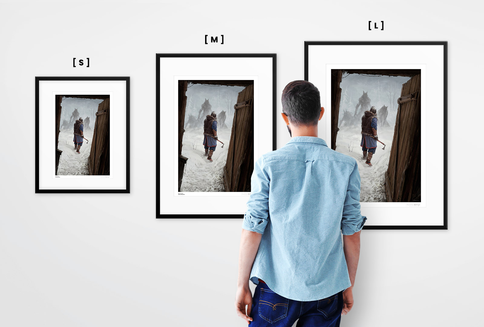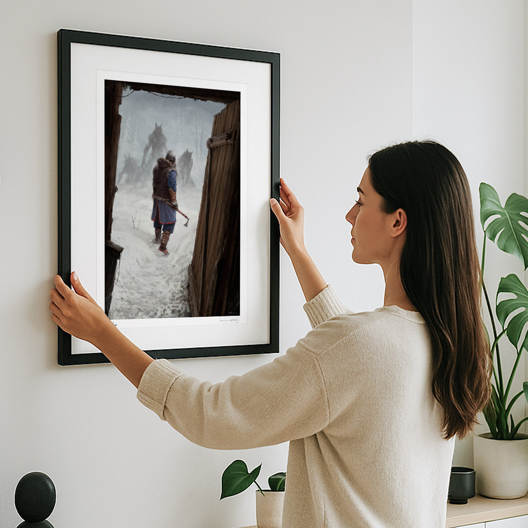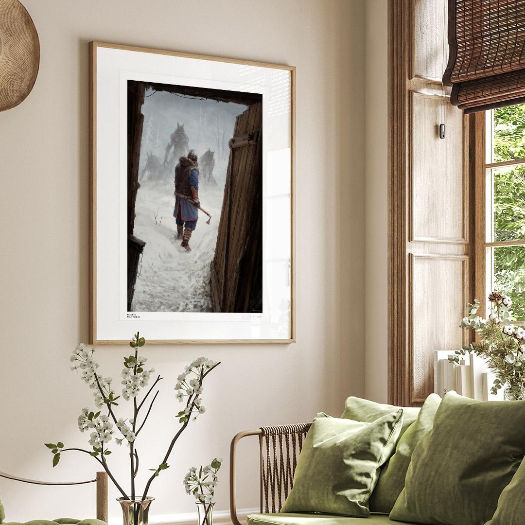 The painting “Knock Knock” by Jakub Różalski comes from the dark universe of “Wolfpack.” The work depicts a hero bracing for a confrontation with approaching werewolves, in a scene filled with tension and dread. The winter landscape and realistic details enhance the atmosphere of the impending clash. Add a unique mood to your space with the collector’s print “Knock Knock.”
