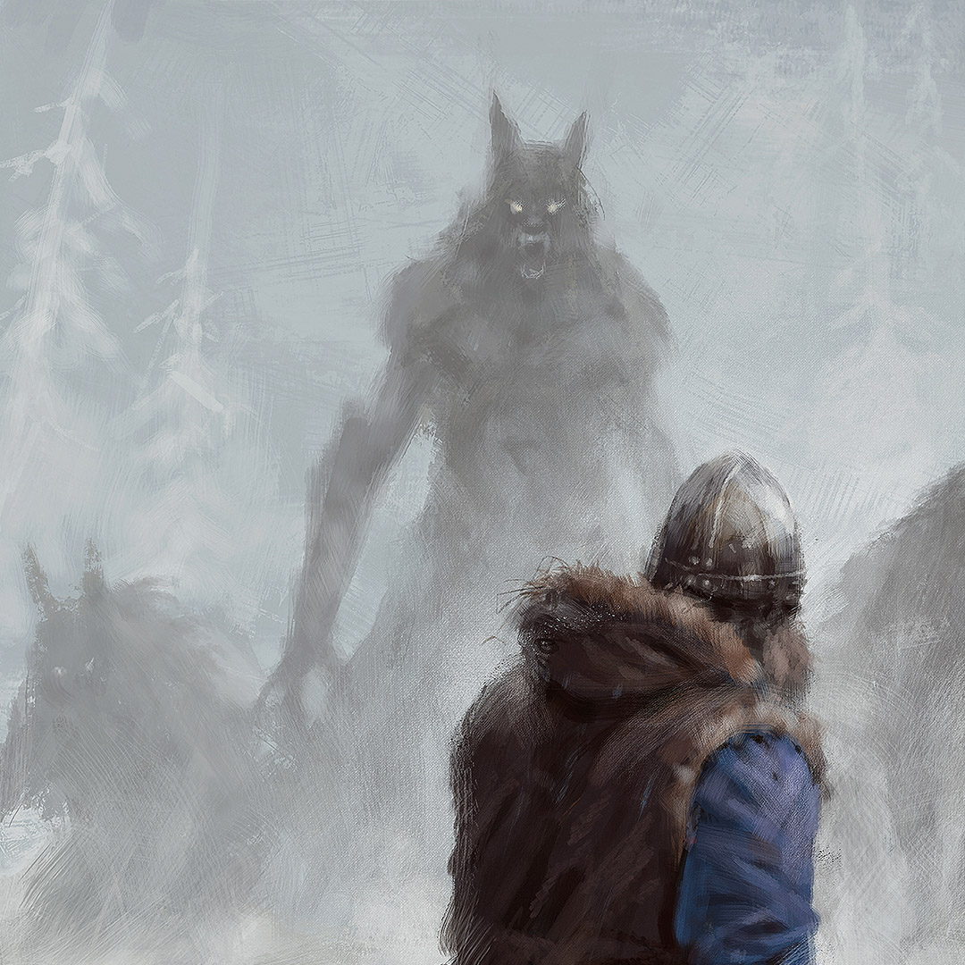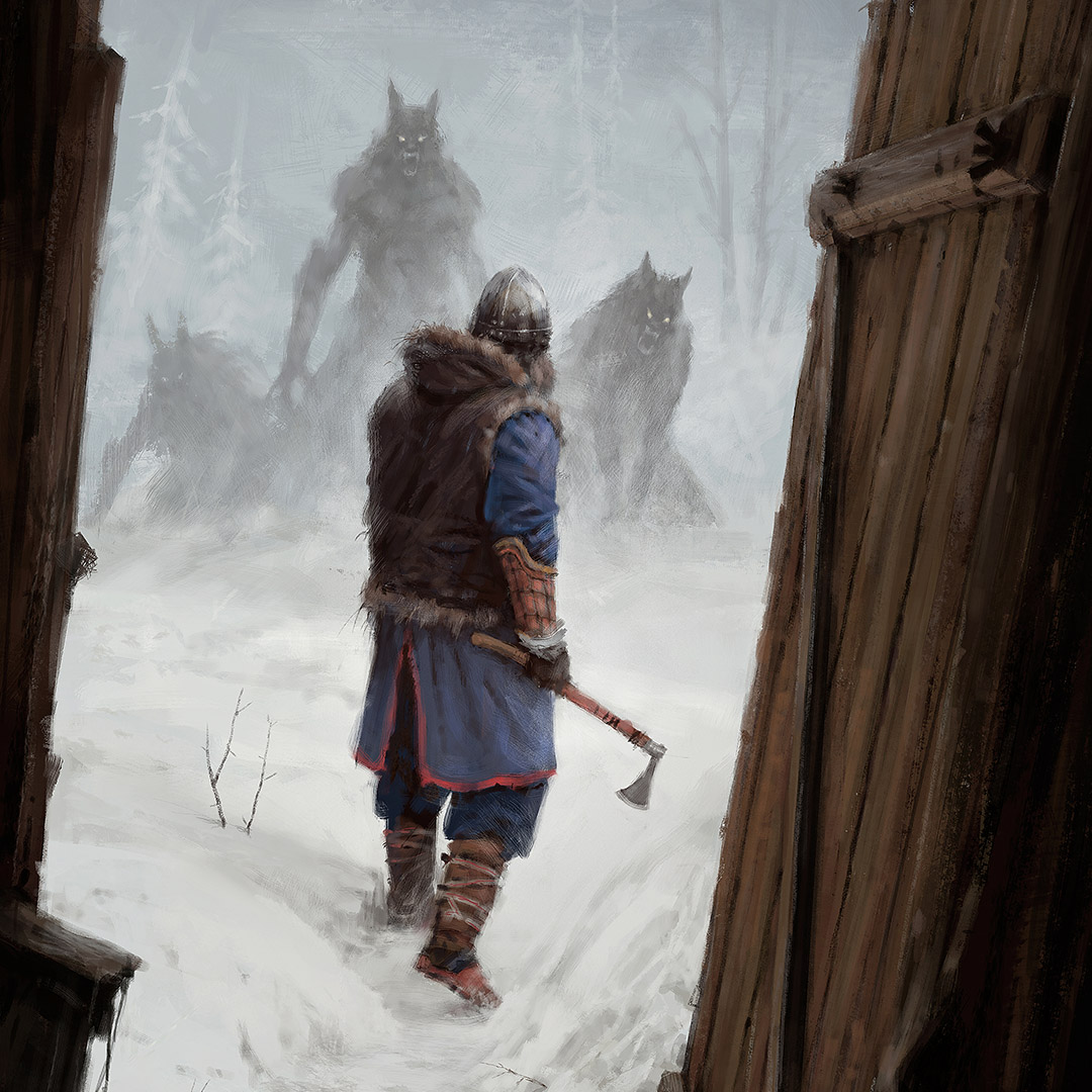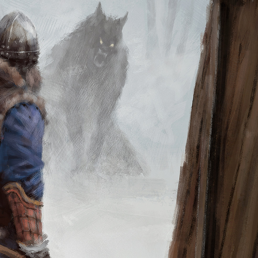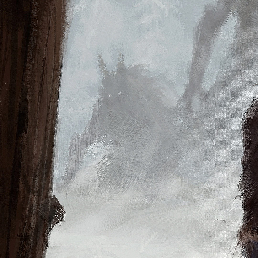 The painting “Knock Knock” by Jakub Różalski comes from the dark universe of “Wolfpack.” The work depicts a hero bracing for a confrontation with approaching werewolves, in a scene filled with tension and dread. The winter landscape and realistic details enhance the atmosphere of the impending clash. Add a unique mood to your space with the collector’s print “Knock Knock.”