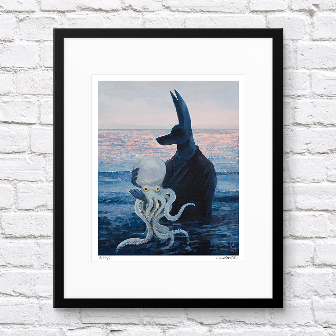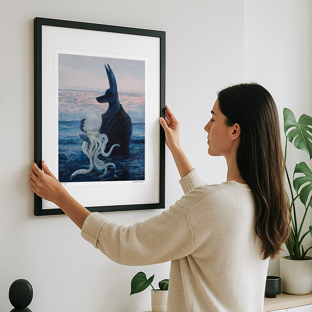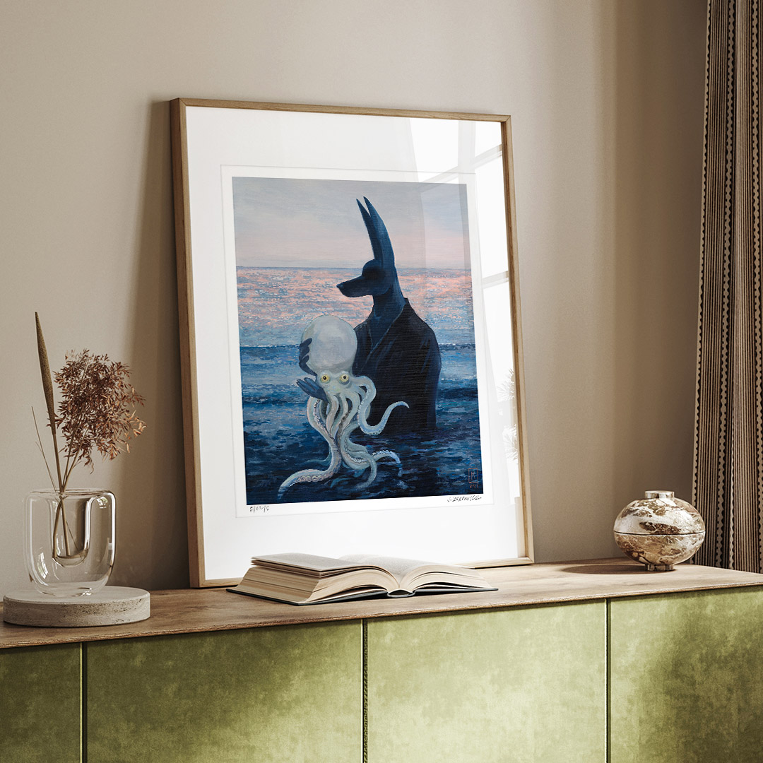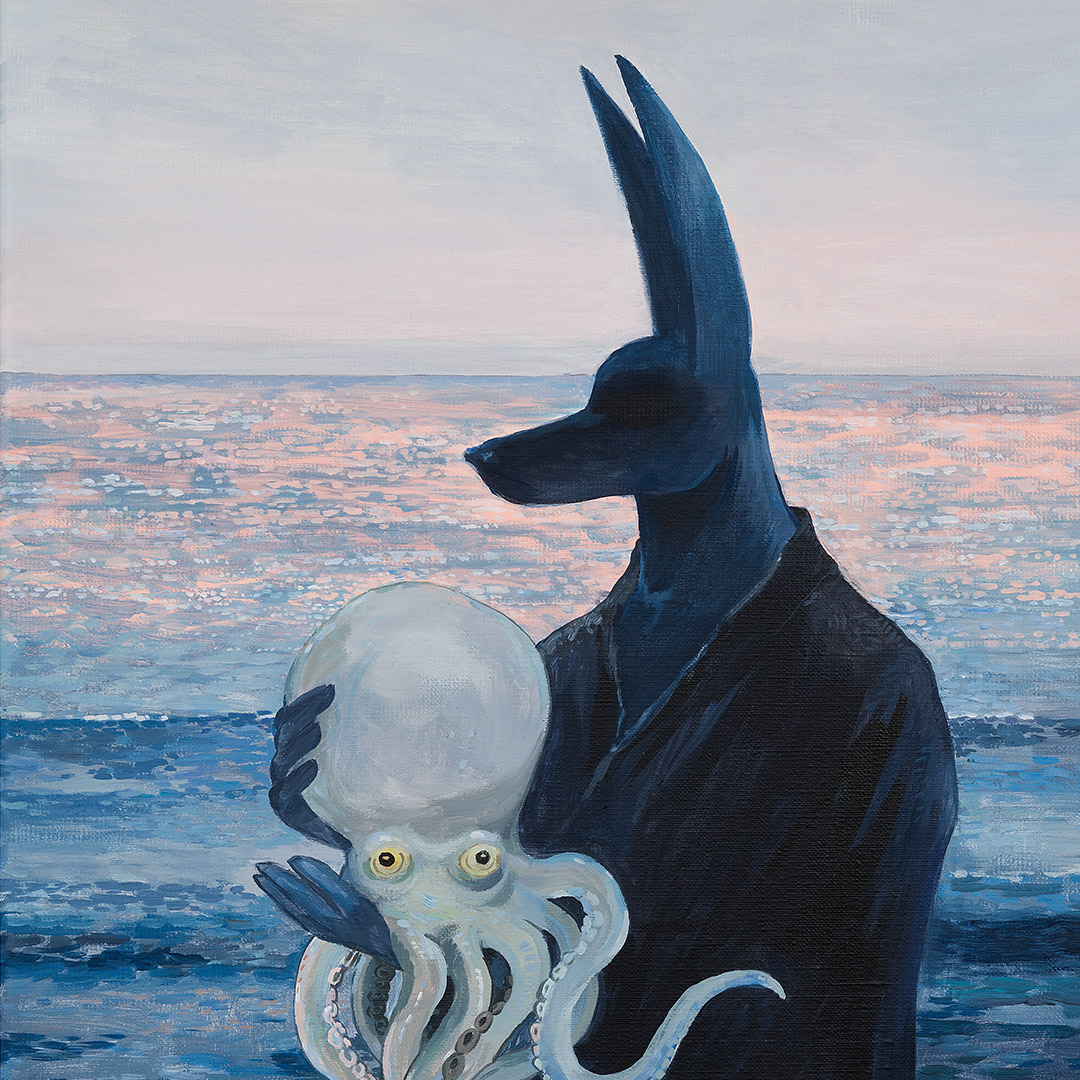 “Octopus” by Joanna Karpowicz is an atmospheric and symbolic painting in which the mysterious figure of Anubis stands against the backdrop of a calm sea illuminated by the pink glow of sunset. In his arms, he holds a pale octopus, creating an extraordinary combination of mythology, surrealism, and a maritime atmosphere. The piece captivates with its subtle color palette, precise detailing, and an atmosphere filled with silence and metaphor.