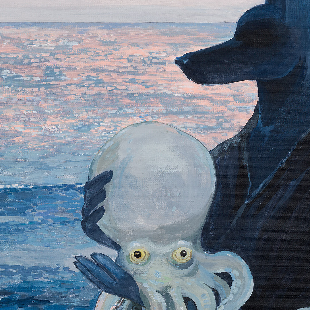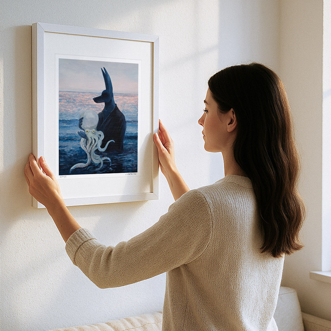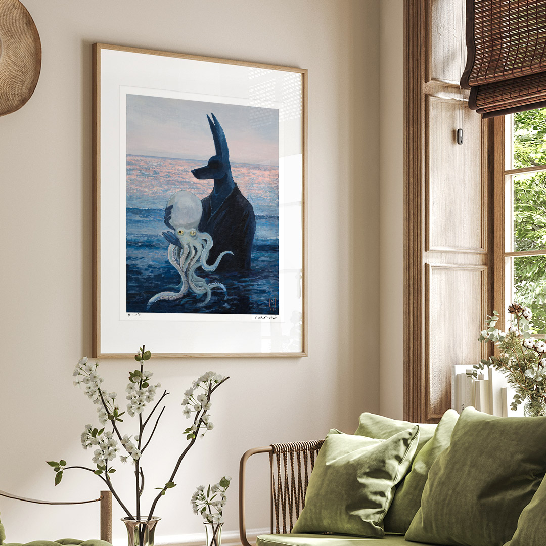 “Octopus” by Joanna Karpowicz is an atmospheric and symbolic painting in which the mysterious figure of Anubis stands against the backdrop of a calm sea illuminated by the pink glow of sunset. In his arms, he holds a pale octopus, creating an extraordinary combination of mythology, surrealism, and a maritime atmosphere. The piece captivates with its subtle color palette, precise detailing, and an atmosphere filled with silence and metaphor.