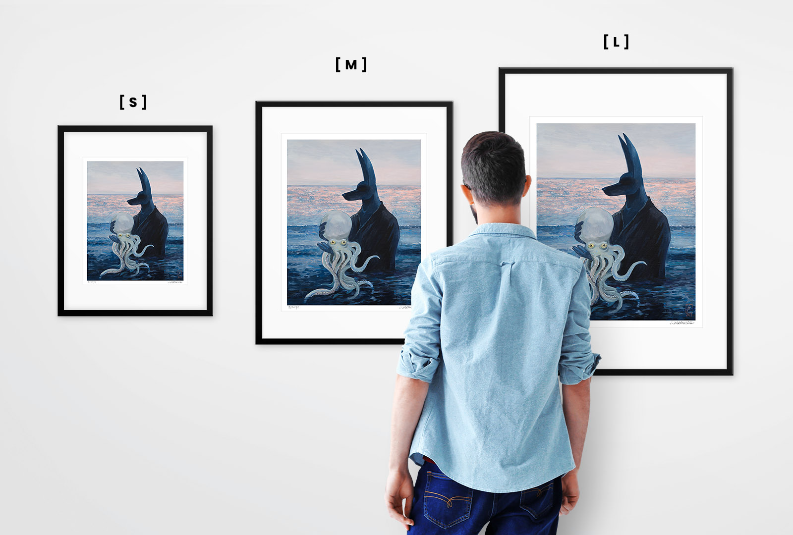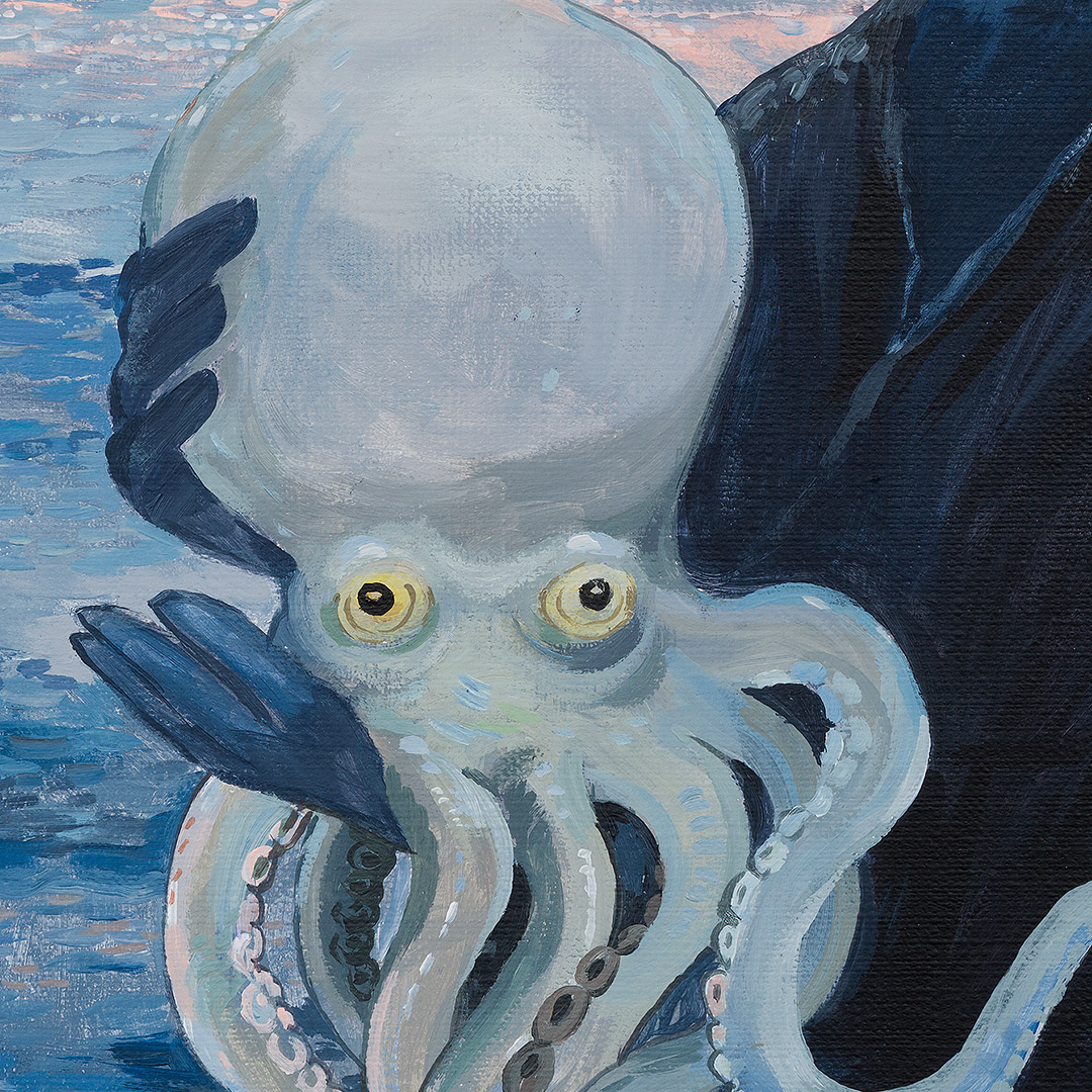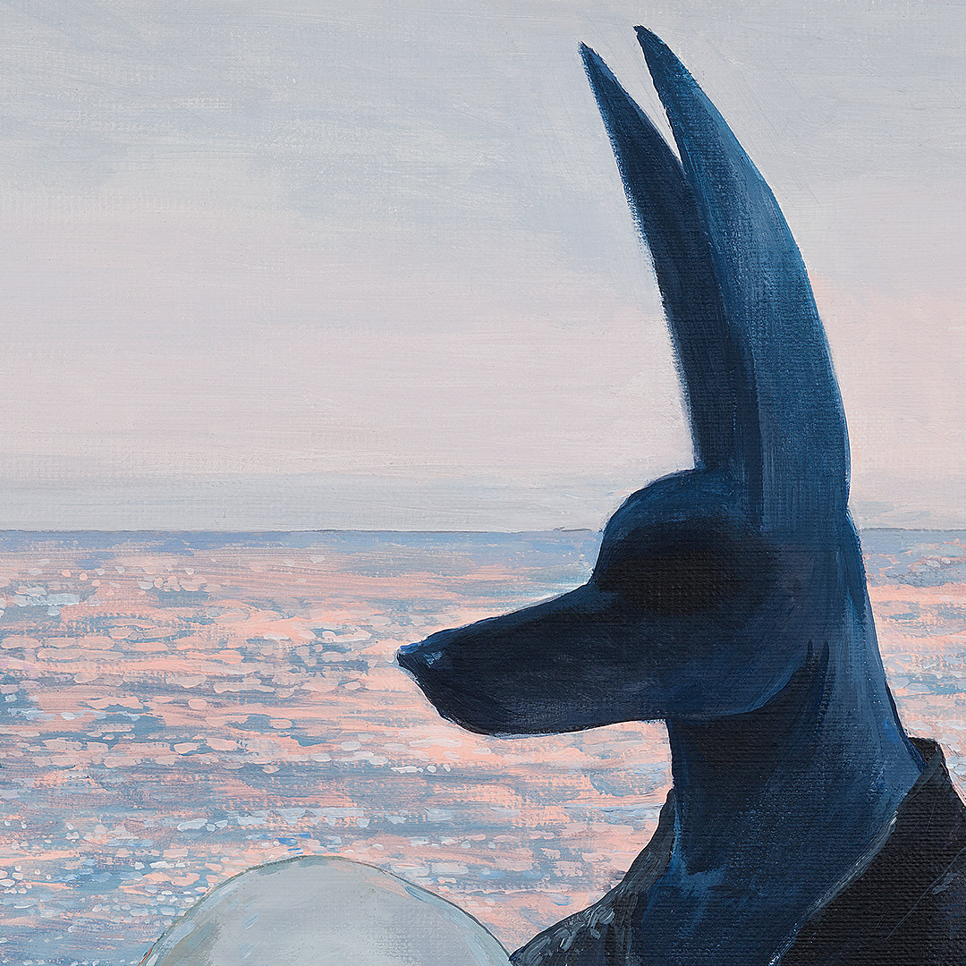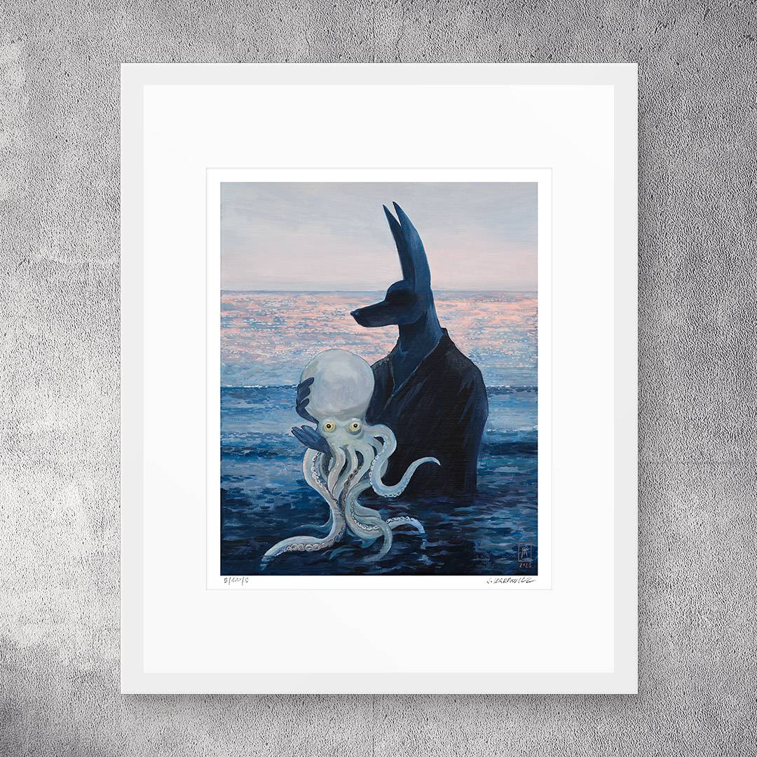 “Octopus” by Joanna Karpowicz is an atmospheric and symbolic painting in which the mysterious figure of Anubis stands against the backdrop of a calm sea illuminated by the pink glow of sunset. In his arms, he holds a pale octopus, creating an extraordinary combination of mythology, surrealism, and a maritime atmosphere. The piece captivates with its subtle color palette, precise detailing, and an atmosphere filled with silence and metaphor.