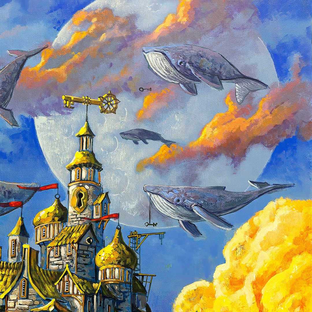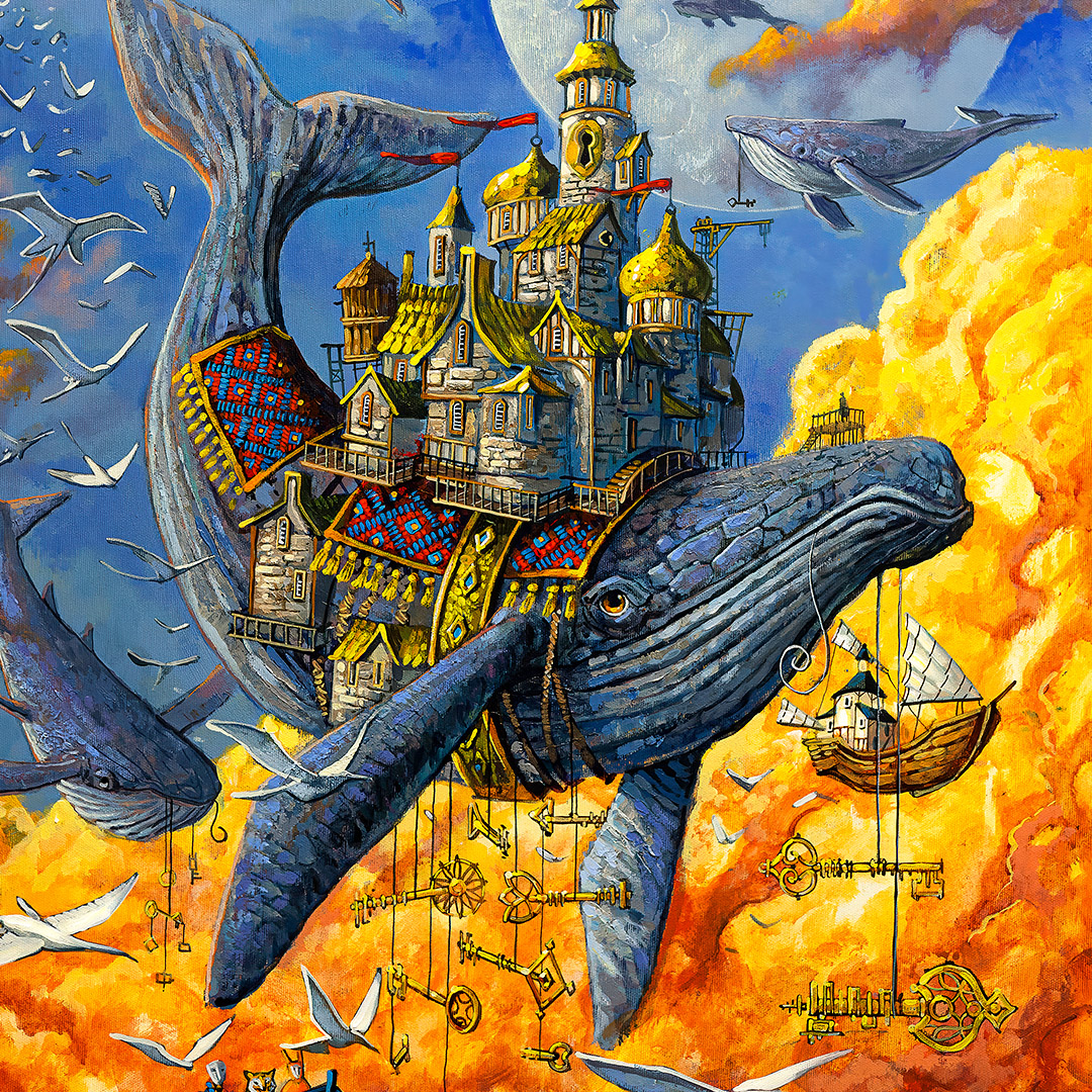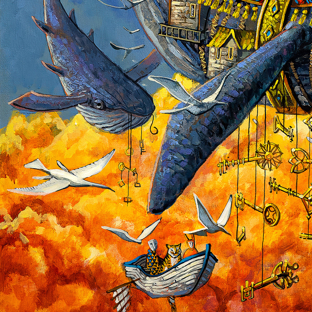 “Klucznik” by Roch Urbaniak is a spectacular work that combines fantasy and surreal narrative. The central motif of the painting is a majestic palace floating on the backs of giant whales, seemingly drifting among golden clouds and a radiant sky. Urbaniak’s painterly vision blends maritime, architectural, and fairy-tale elements, creating a world straight out of imagination. Around the floating palace, smaller boats, birds, and delicate structures soar, giving the composition a dynamic sense of movement and lightness. The figure of the Keykeeper appears as the guardian of this otherworldly space – a symbol of a protector of secrets, guide through unknown worlds, and keeper of knowledge.