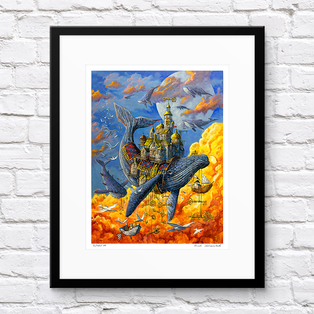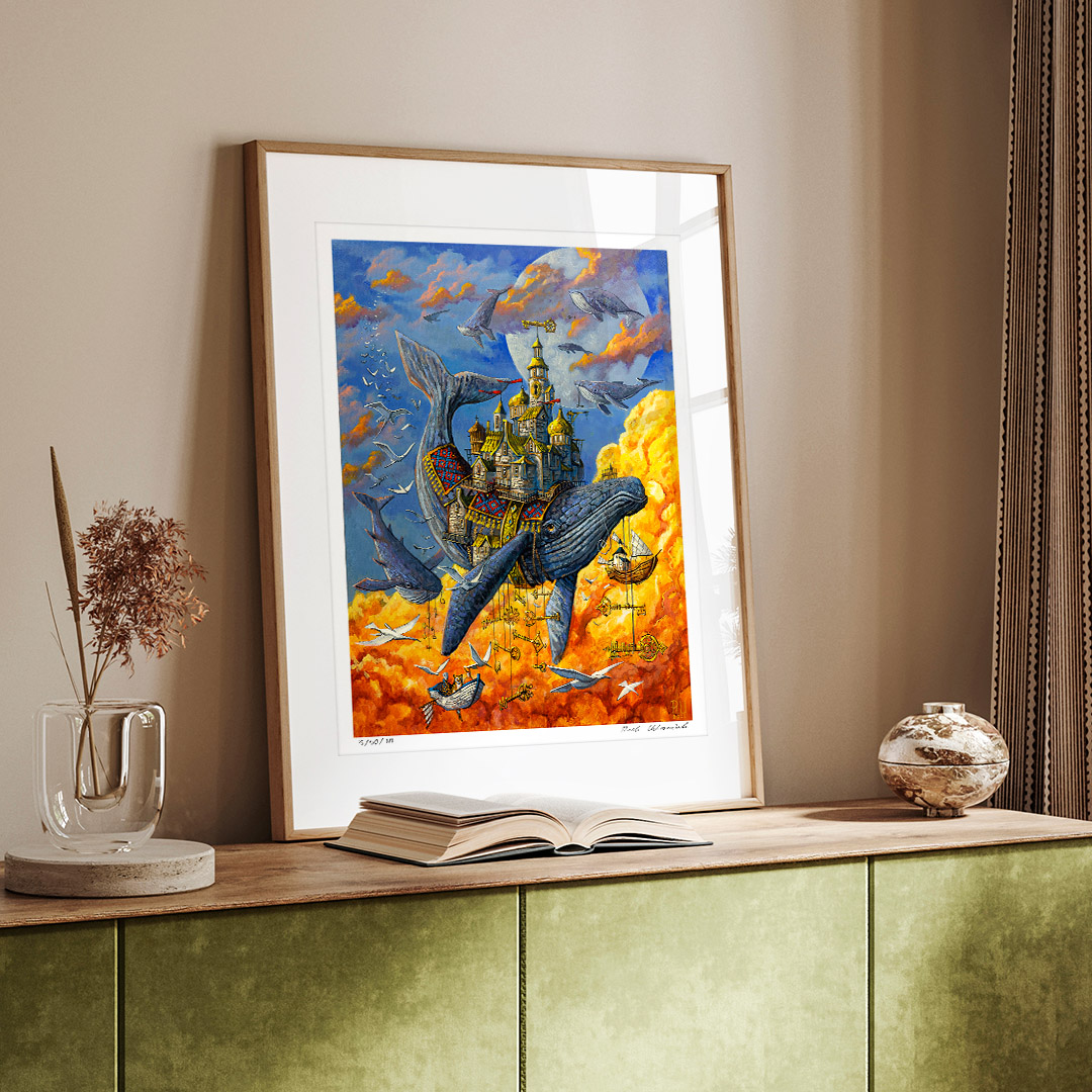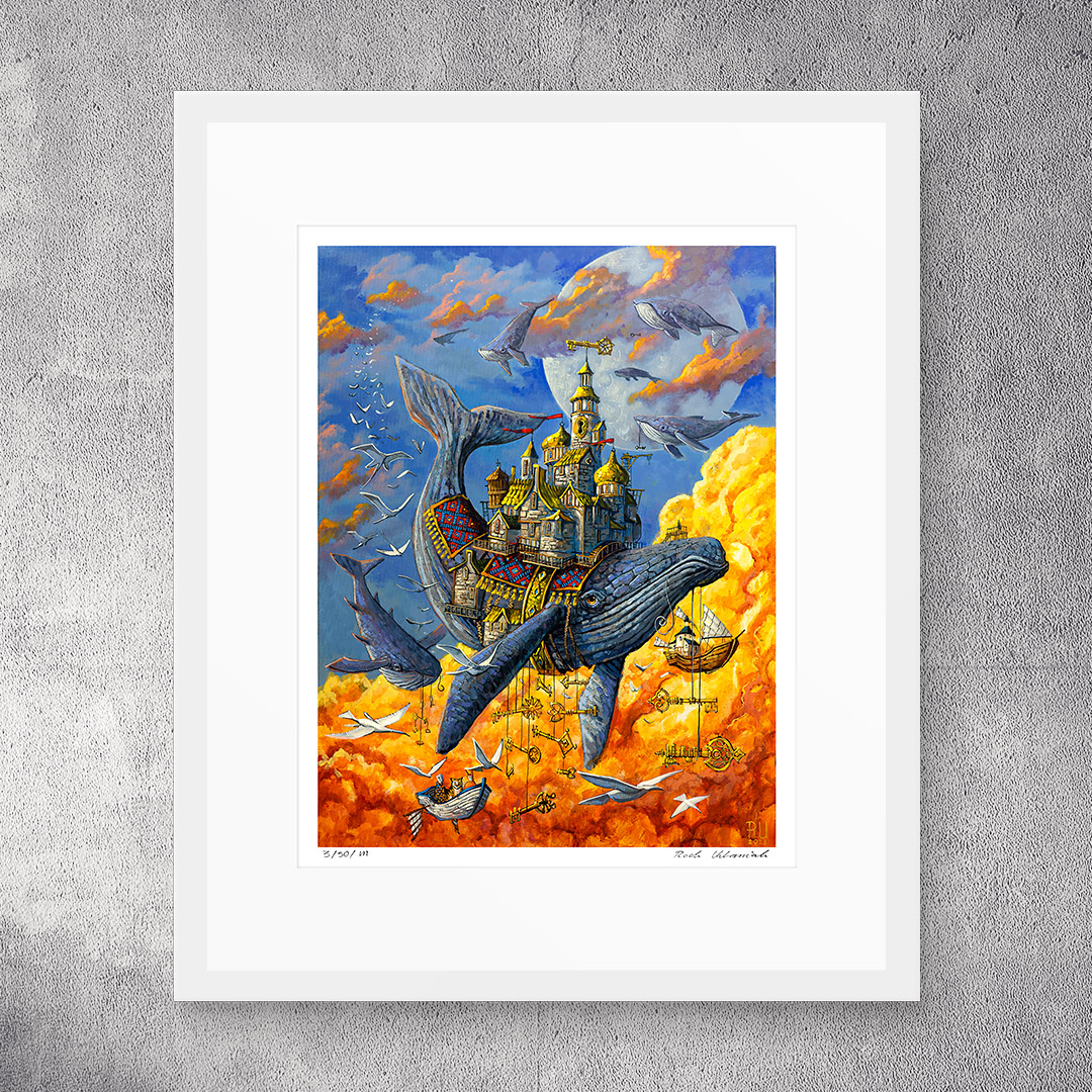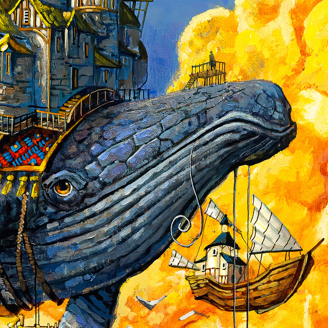 “Klucznik” by Roch Urbaniak is a spectacular work that combines fantasy and surreal narrative. The central motif of the painting is a majestic palace floating on the backs of giant whales, seemingly drifting among golden clouds and a radiant sky. Urbaniak’s painterly vision blends maritime, architectural, and fairy-tale elements, creating a world straight out of imagination. Around the floating palace, smaller boats, birds, and delicate structures soar, giving the composition a dynamic sense of movement and lightness. The figure of the Keykeeper appears as the guardian of this otherworldly space – a symbol of a protector of secrets, guide through unknown worlds, and keeper of knowledge.