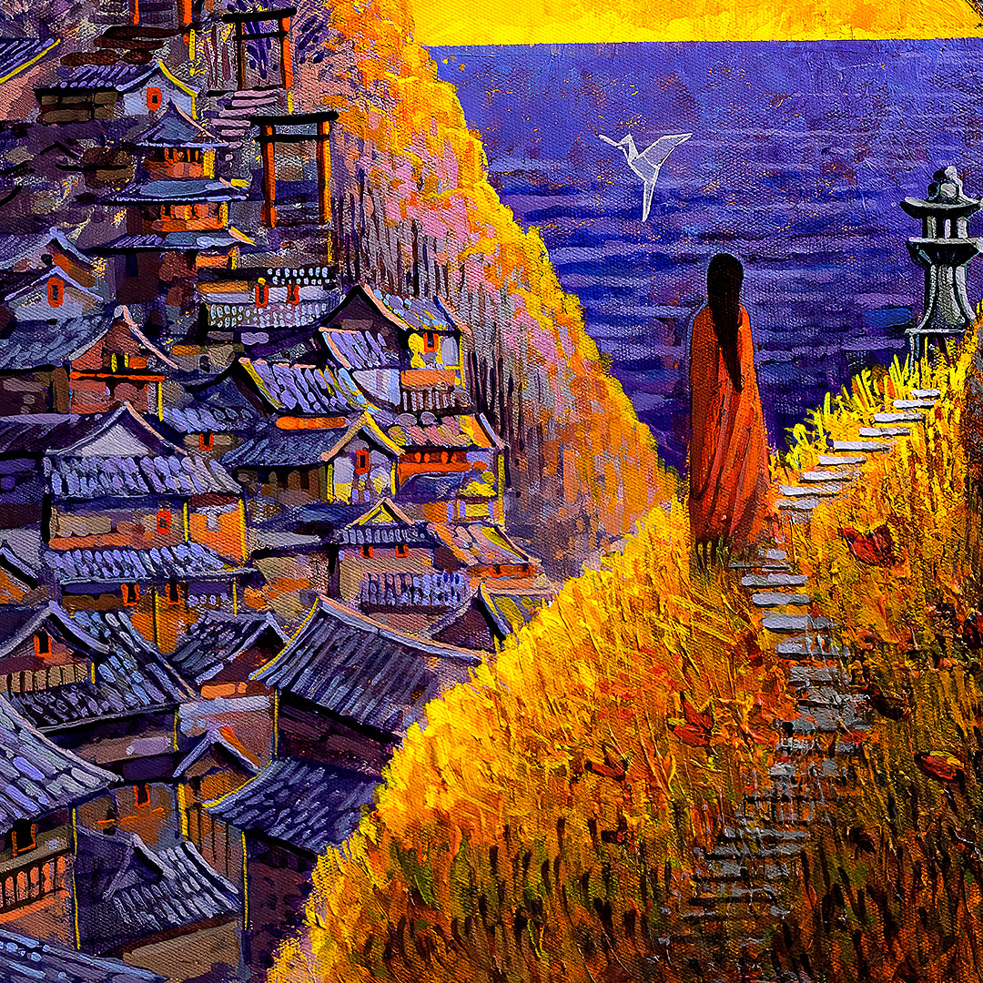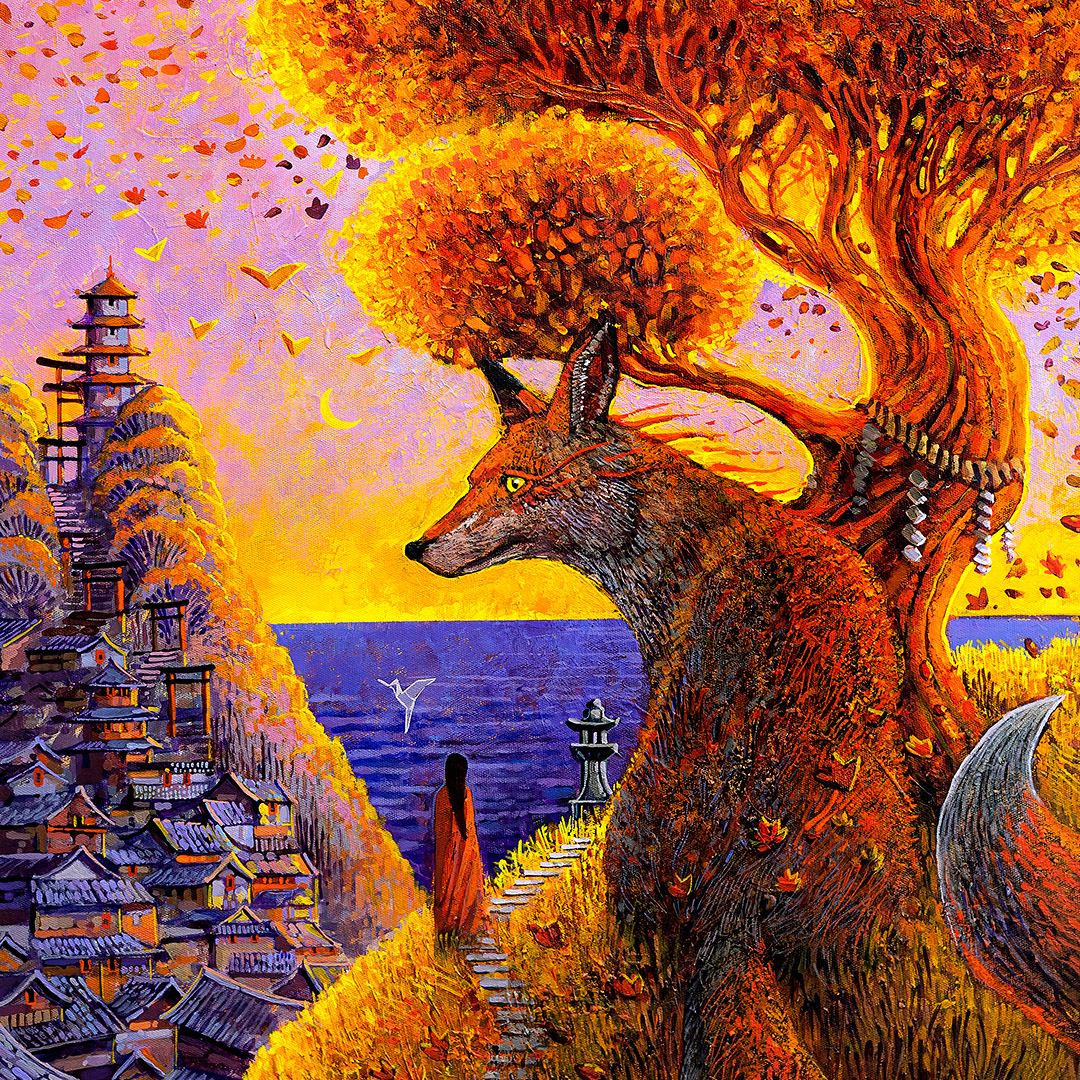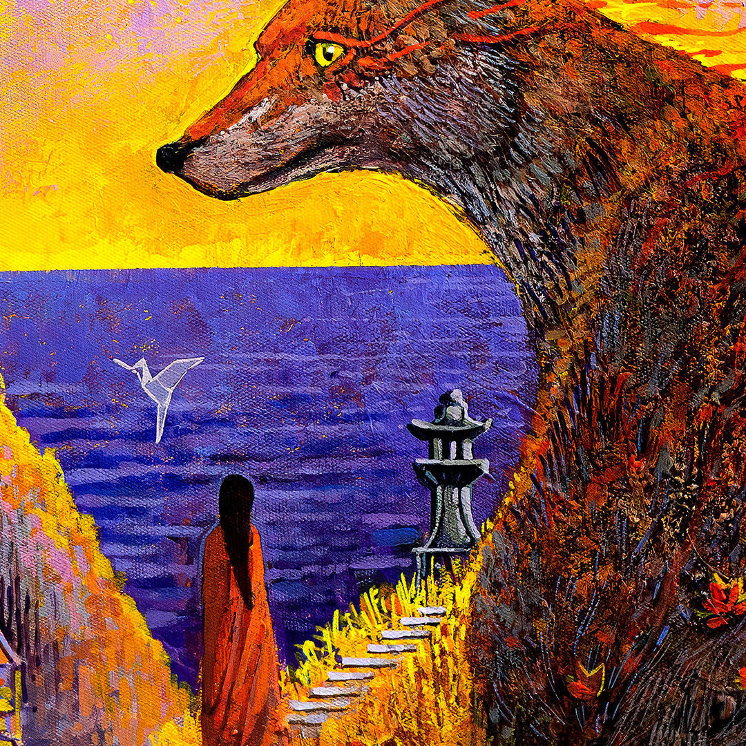 “Benkei” is a captivating painting by contemporary artist Roch Urbaniak. The artwork depicts a fiery orange fox appearing against the backdrop of water and an urban landscape, while in the distance, a woman in an orange dress can be seen, adding a mysterious narrative accent to the composition. The artist employs vivid, contrasting colors, with the intense shades of the fox and the woman’s dress contrasting against the cooler tones of the water and city. This gives the painting a dynamic character and draws the viewer’s attention, creating an atmosphere full of energy and subtle mystery.