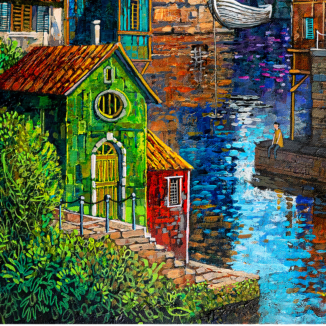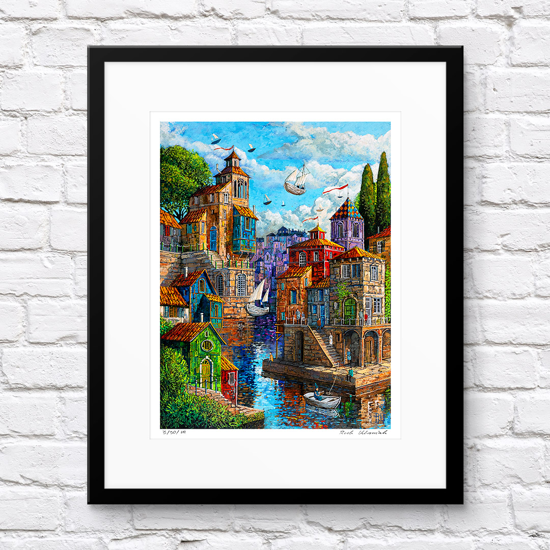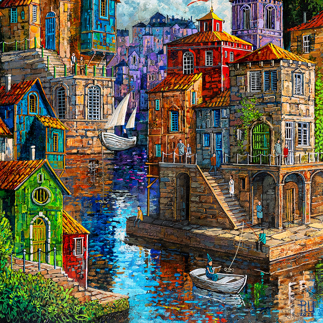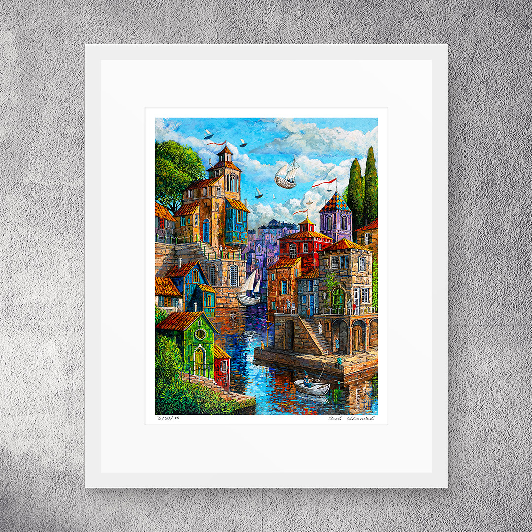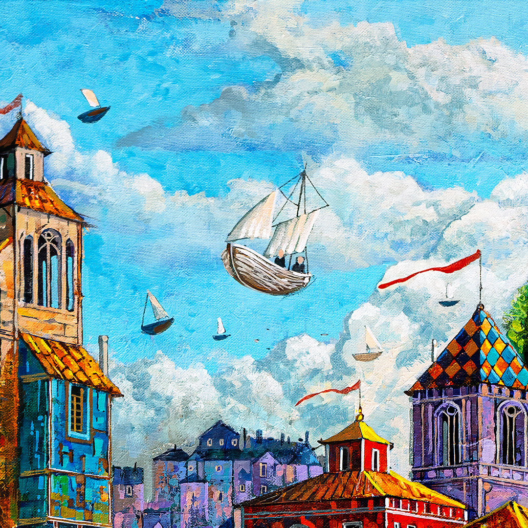 “Late Morning” is a captivating painting by Roch Urbaniak, created with acrylic on canvas, depicting a picturesque cityscape by the water. In the foreground, a row of colorful houses reflects in the calm surface of a river or lake, giving the composition a sense of lightness and harmony. A unique element of the painting is the sky filled with floating boats, adding a surreal and almost poetic atmosphere to the scene. This artistic touch draws the viewer’s attention and sparks the imagination. The artist uses vivid, contrasting colors that emphasize the individual character of each building.